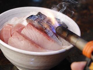 温かいご飯にのった厚切りの刺身を目の前でバーナーで炙ります。この演出に驚かれるお客様も多いとか。